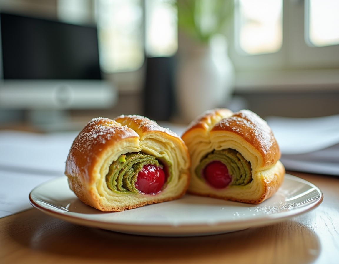 Un feuilleté croustillant et léger, garni d’une compotée de griottes acidulées et d’une crème onctueuse à la pistache. Parfait pour un dessert raffiné ou un goûter gourmant.
