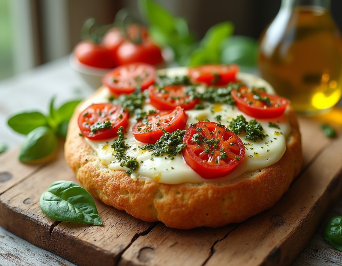 Ingrédients : farine de blé, eau, mozzarella, tomates séchées, pesto, huile d’olive, sel, levure