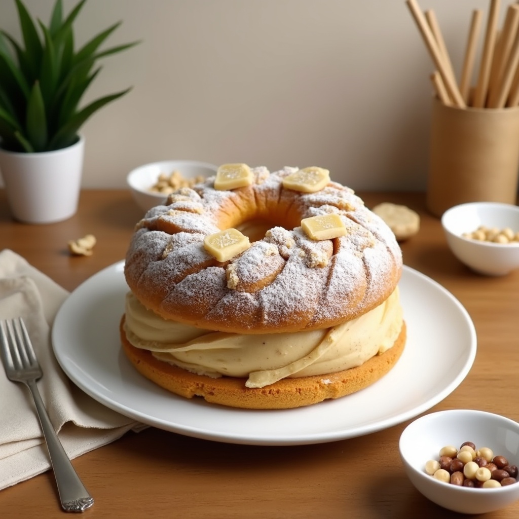 Un Paris-Brest apprécié pour sa forme originale en couronne, garni d’une crème pralinée onctueuse et parsemé d’éclats de noisettes torréfiées. Un dessert gourmand et pratique à partager.